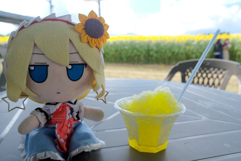 毎年そうなんですが第1畑のひまわりは全体的に背が高く茎も太く葉っぱも大きい種類が植えてあり、ボクが愛用しているふもふもシリーズのぬいぐるみが座ることが出来ます(厳密に言うと初期の頃の柔らかい頃の子たち)
