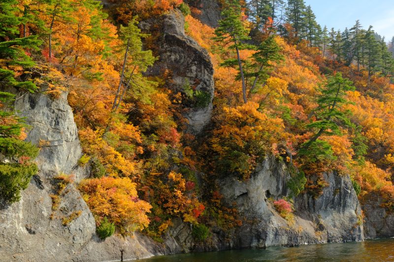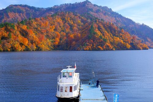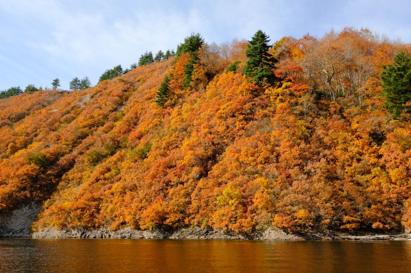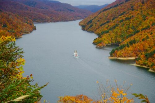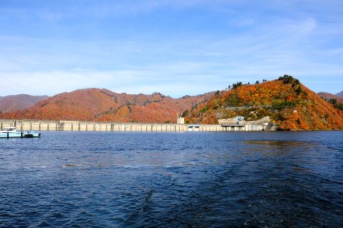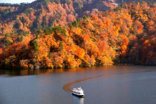 こういう紅葉の中のダムを進む遊覧船ってすごく良いですよね。遊覧船がカーブしてその航跡がしっかり残っているのがまた良いです。ちなみに写真をタップ(クリック)すると大きい写真が出ますよ(PCやタブレットPCじゃないとあんまり意味はありませんが💦)