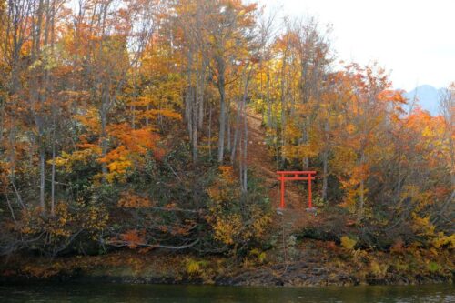 遊覧船では解説らしき放送がない(デッキにいたから聞こえなかった?)ので、何なのかわかりませんでしたが、十二山神社があるらしいです。釣り客向けの民宿が船を出してくれるらしく行くことも可能らしいですが、不思議な神社ですね。カヤックを持ち込んで自力で行った人も調べたら居ましたね。行動力お化けです😅