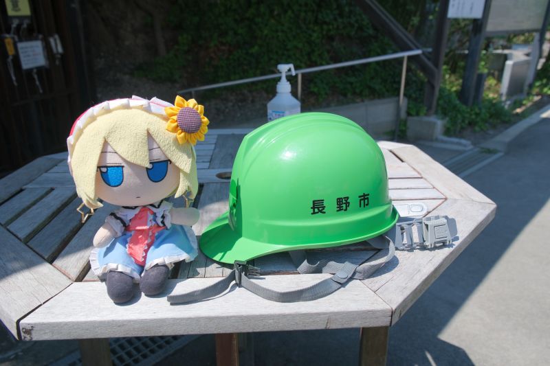 入坑にはヘルメットが必要です。ちゃんと長野市の持ち物なので【長野市】の印字があります。
