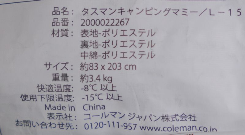 コールマンのタスマンキャンピングマミー/L-15です。現行品です。