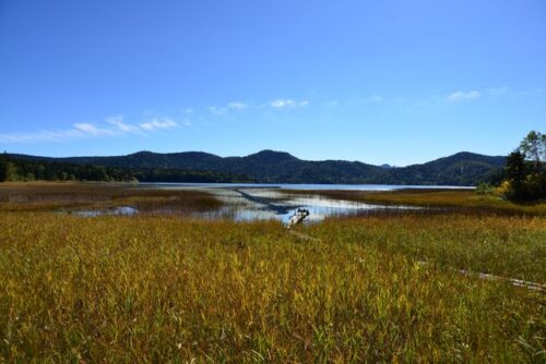 浅湖湿原では尾瀬沼の向こうにかすかに見えるビジターセンターらしき建物がチラチラし始めてきました。