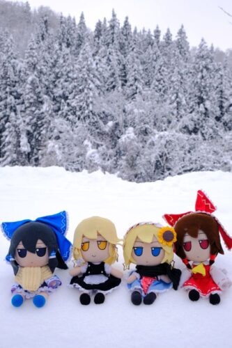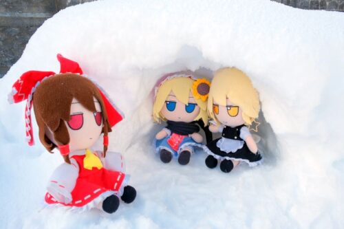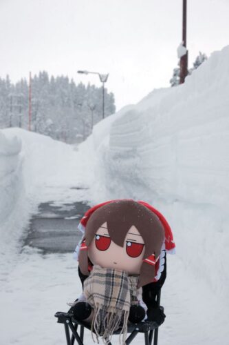 雪の壁の上に霊夢さんに座ってもらっています😊