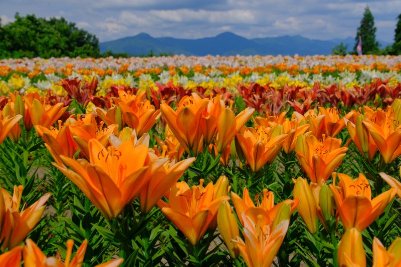 ユリ畑はまんなかに大きい通路があり、向こうにある山々でいい感じに撮影ができるかもです